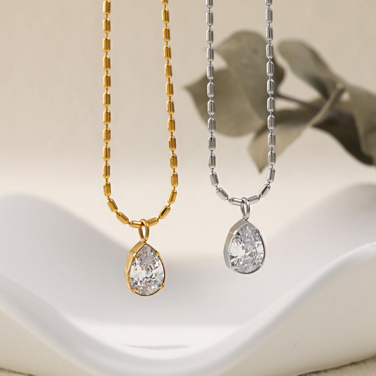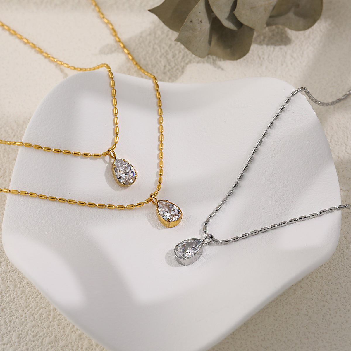Made from durable titanium steel with a stylish water drop zircon pendant.