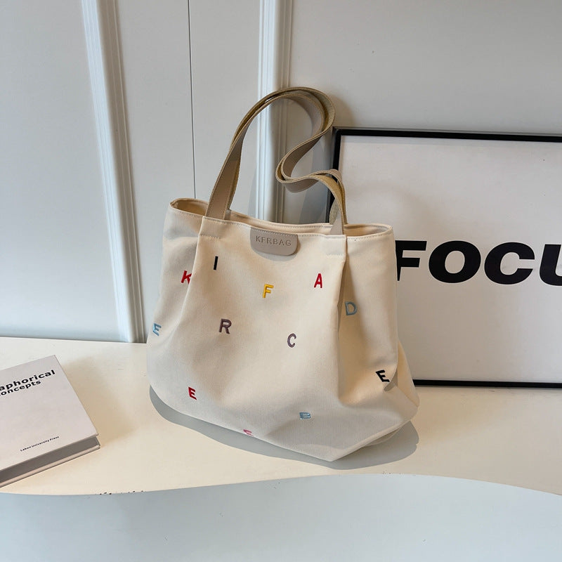This women's fashionable tote bag blends urban simplicity with functionality. The large capacity design and stylish letter embroidery make it the perfect accessory for daily use, shopping, or outings. Made from durable canvas material, it offers both style and practicality.