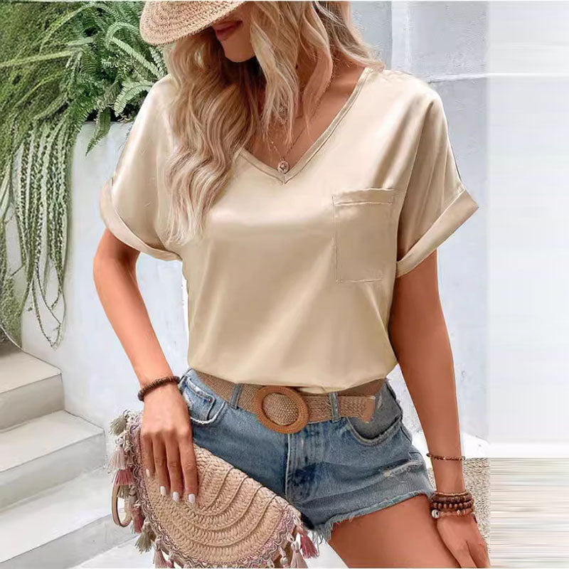 Women Satin V-Neck Pocket Short-Sleeved Loose Solid Blank T-Shirt