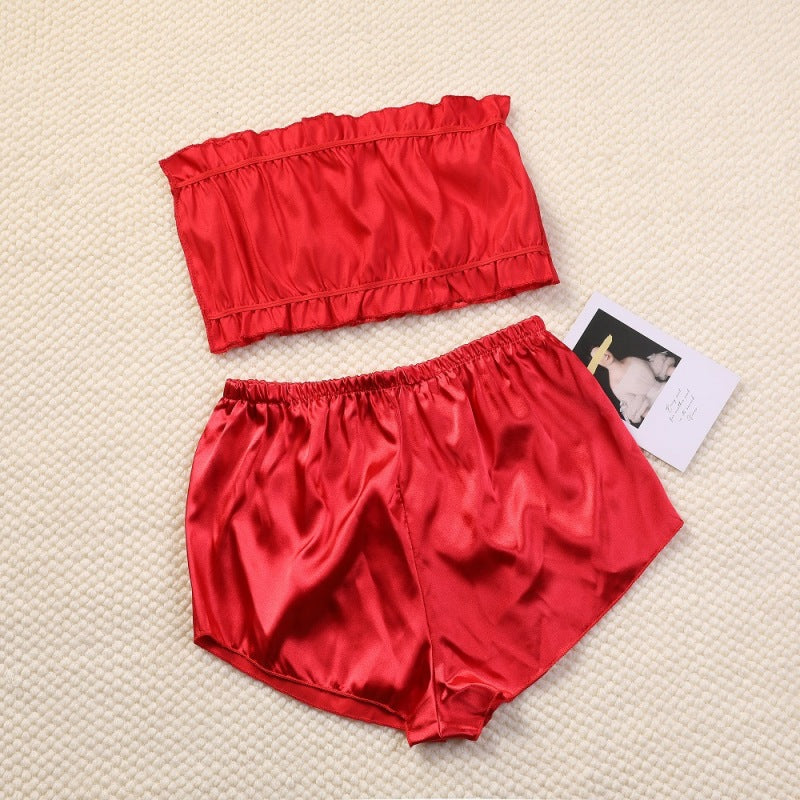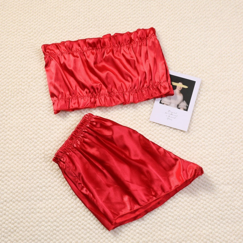 Women Sexy Solid Color Tube Top Satin Pajamas Two-Piece Set