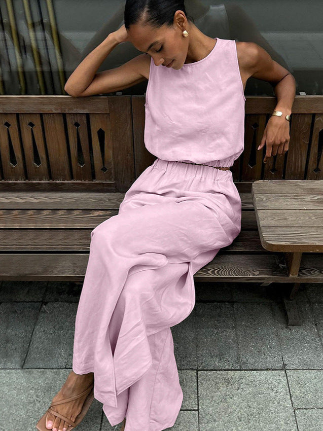 Women Sleeveless Casual Cotton Linen Two-Piece Set with Side Slits