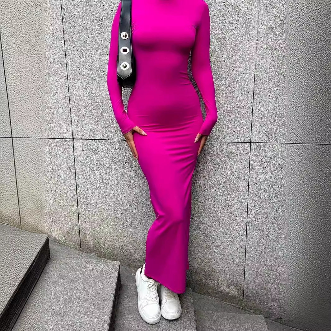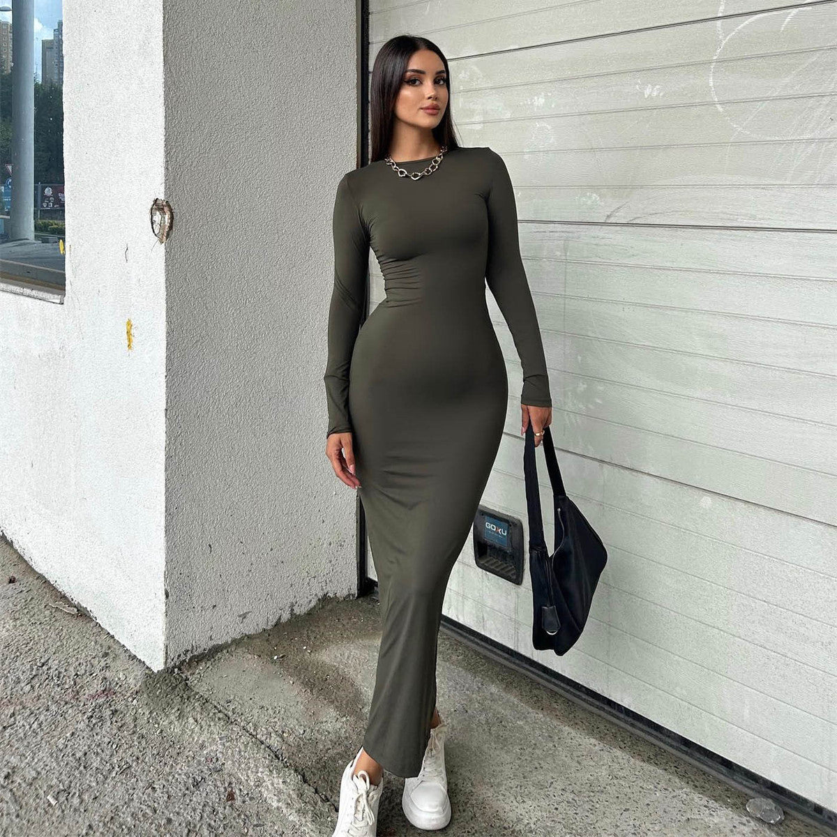 This women’s long sleeve dress features a smooth milk fiber material, a classic round neckline, and a comfortable pullover design. The tight skirt silhouette and mid-waist fit make it ideal for streetwear fashion in various colors and sizes.