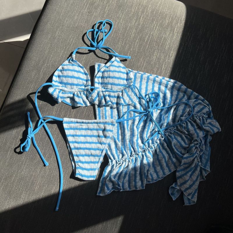 Elevate your beachwear with our Women Summer Lace-Up Halter Strap Stripe Ruffled Skirt Three-Piece Swimsuit Bikini Set. Perfect for any summer getaway, this stylish bikini offers both comfort and flair.