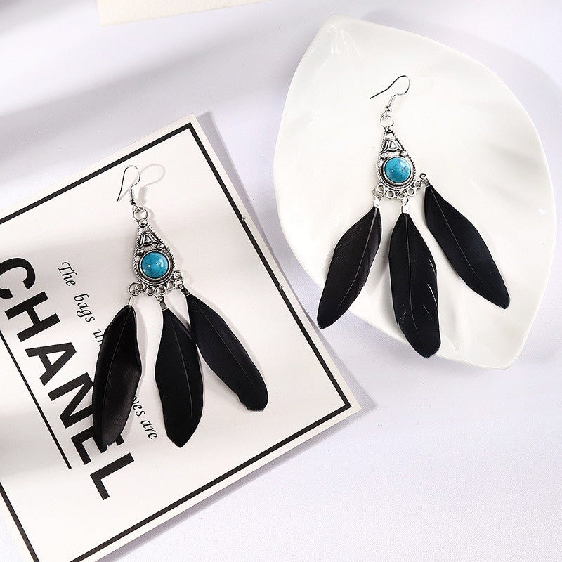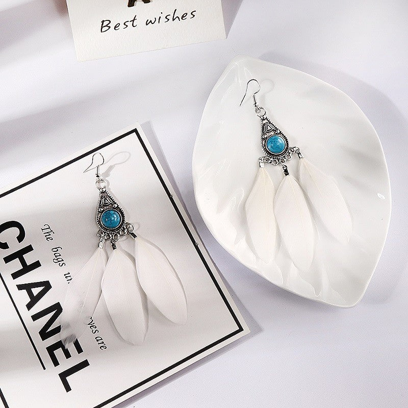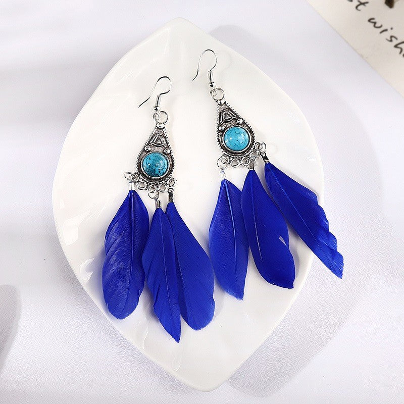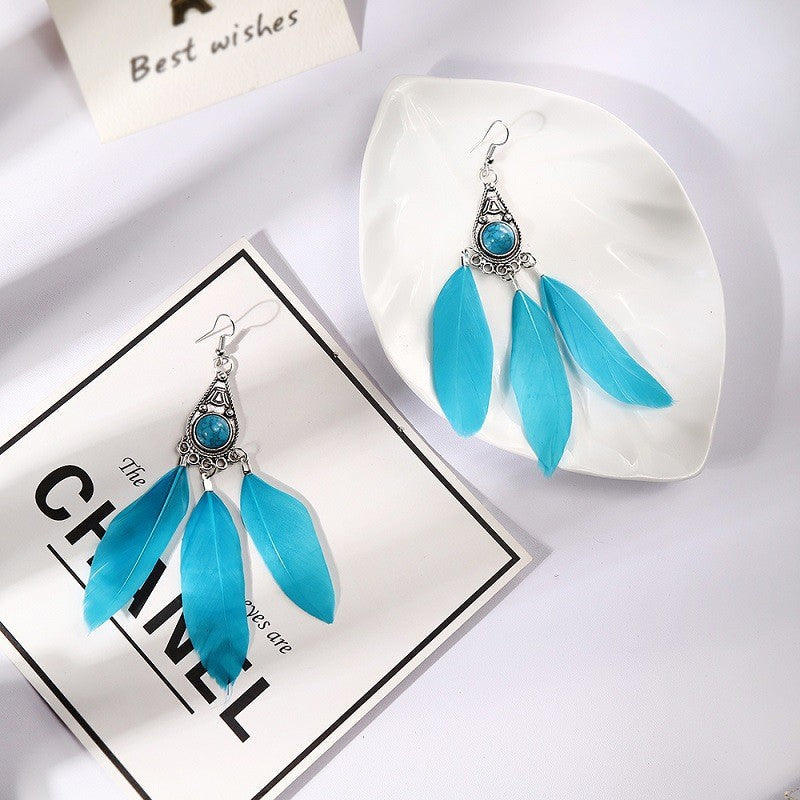 Women Vintage Bohemian Turquoise Feather Dangle Earrings
