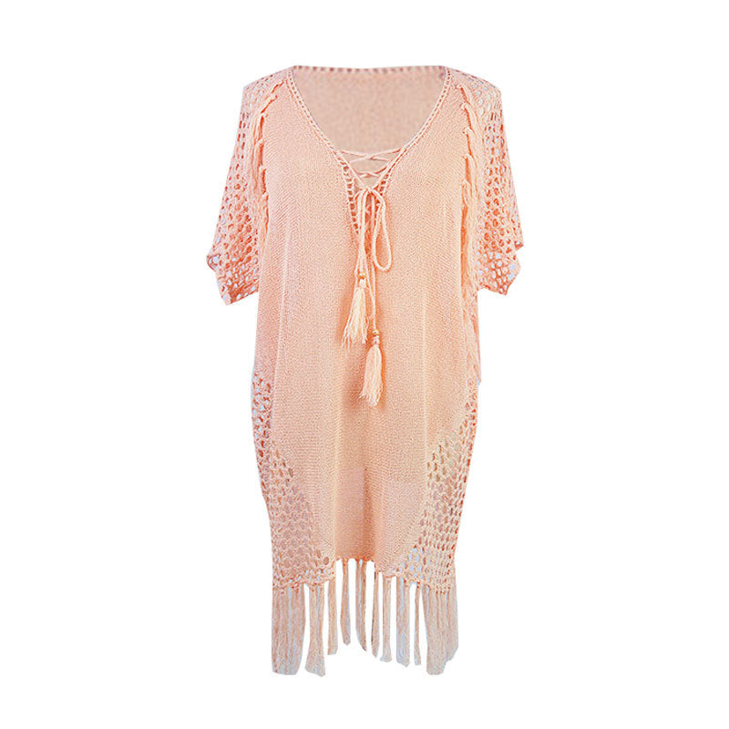 Elevate your beach style with our Women's Fashion Casual Solid Color V-Neck Hollow-Out Thin Knitted Tassels Swimsuit Cover-Up. This versatile cover-up is designed for women who appreciate both comfort and style while soaking up the sun.